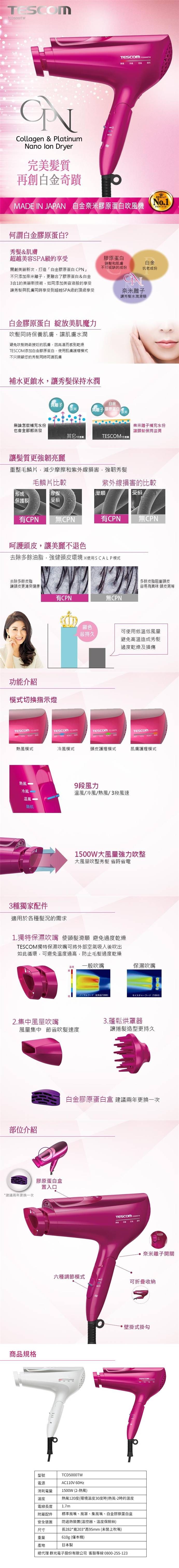 TESCOM TCD5000 日製美髮白金奈米膠原蛋白吹風機(桃紅)