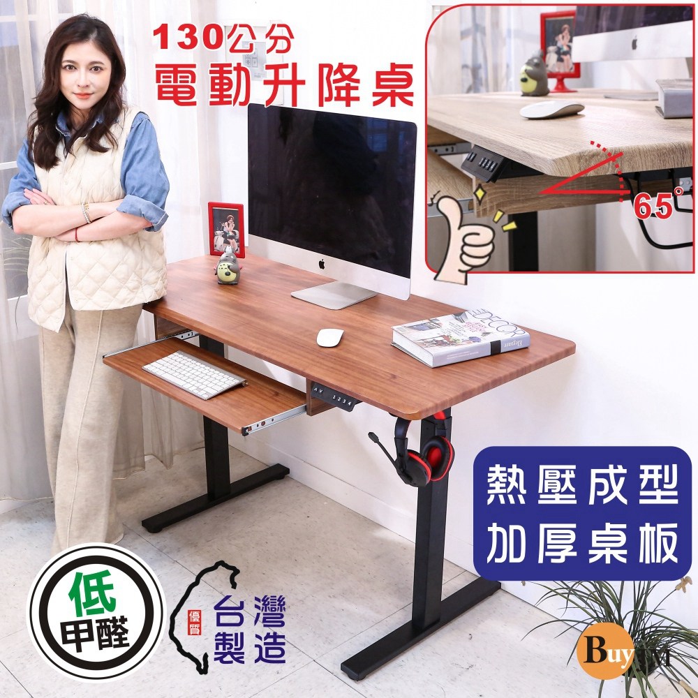 BuyJM MIT低甲醛無銳角附鍵盤無段式電動升降桌(寬130x60公分)/書桌/電腦桌柚木色