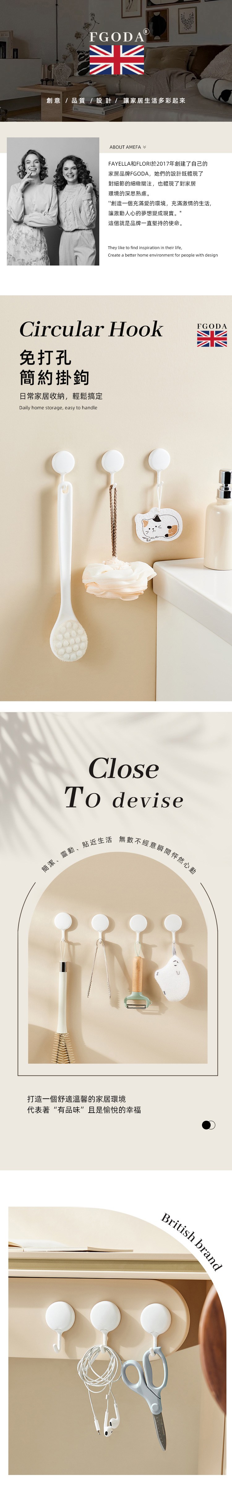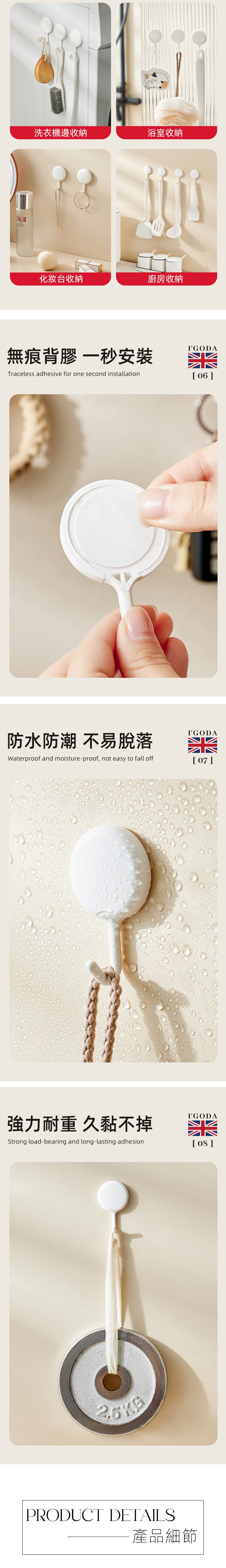 【英國FGODA】無痕免鑽釘壁掛式圓形掛勾(4入裝)x3包