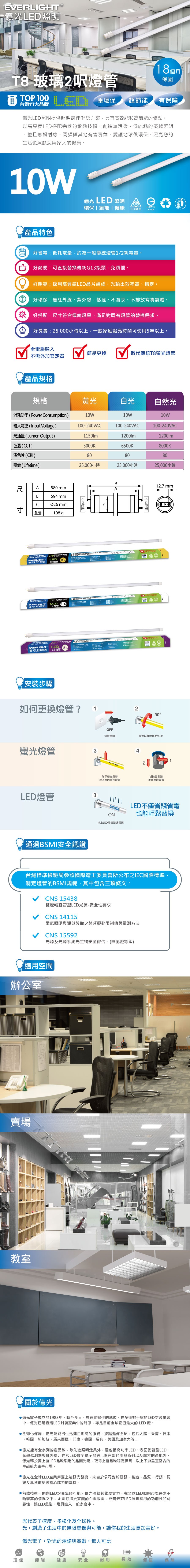 億光T8 10W LED燈管2呎-白光 6500K