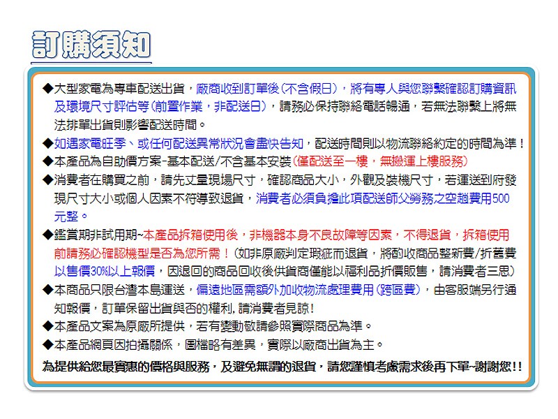 請留意~此賣場為自助價方案-基本運送/不含拆箱定位(僅配送至一樓,恕無上樓服務)