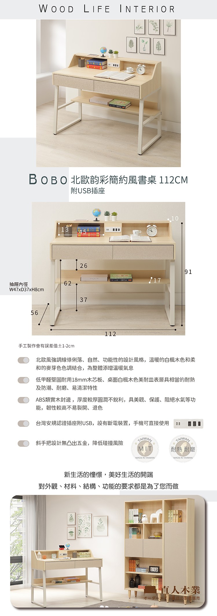 直人木業-BOBO北歐韵彩簡約風書桌112公分(附USB插座)
