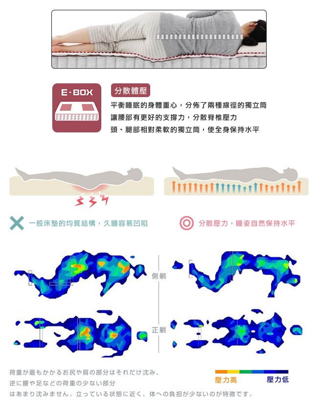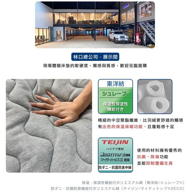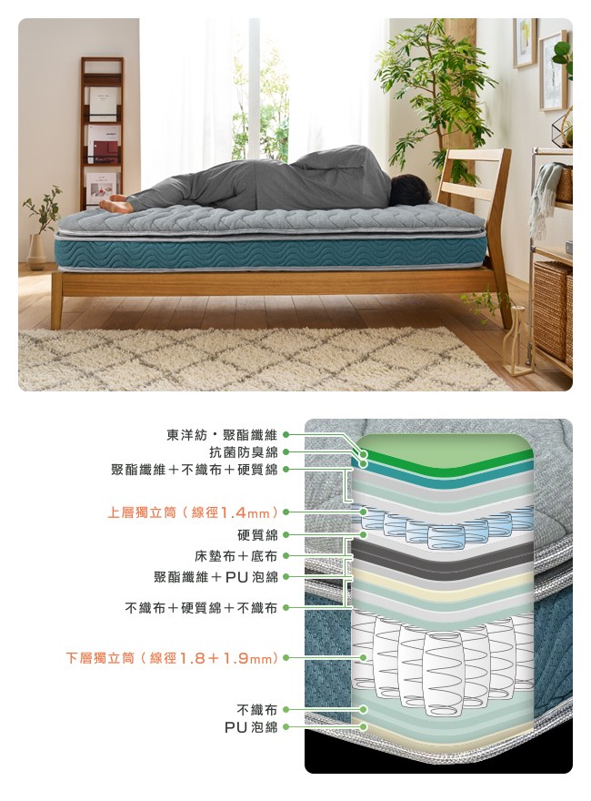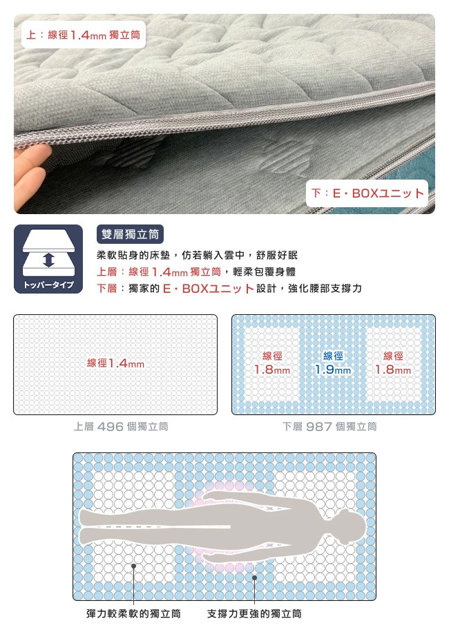 精細的中空聚酯纖維,比羽絨更舒適的觸感,有出色的保溫保暖功能,且蓬鬆感十足。使用的材料擁有優秀的抗菌、除臭功能,並能抑制塵蟎生長。雙層床墊設計,上層:線徑 1.4mm 獨立筒,輕柔包覆身體。下層:獨家的 E・BOX 分散體壓設計(獨立筒線徑 1.8/1.9mm),強化腰部支撐力。