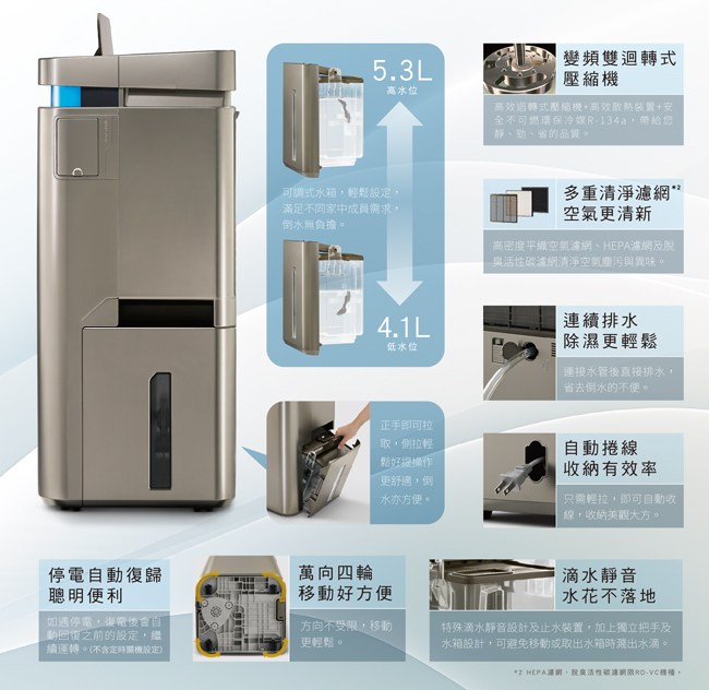 *水箱容量高/低水位二段可調(高約5.3公升;低約4.1公升)