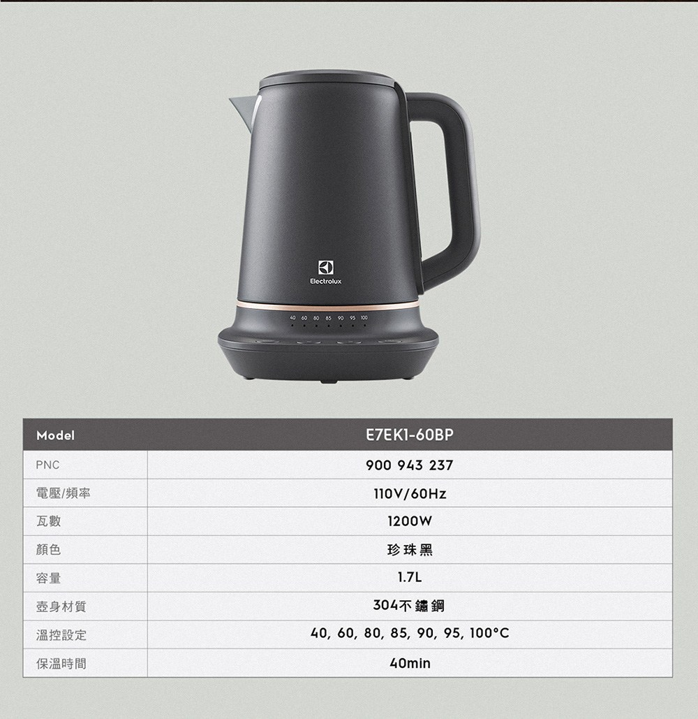 伊萊克斯 智能溫控電茶壺1.7L E5EK1-51BP - 珍珠黑