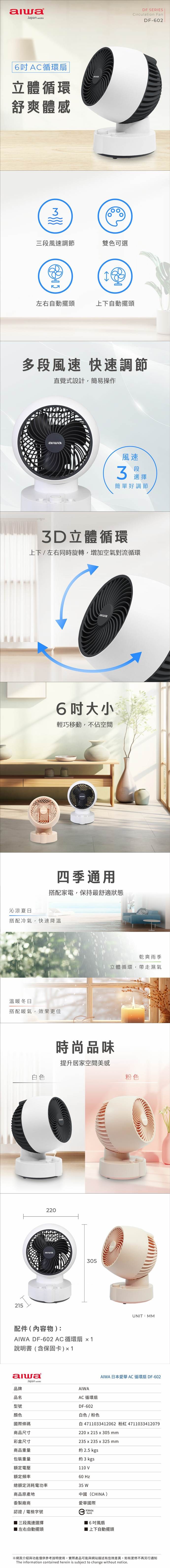 【AIWA 日本 愛華】6吋 AC循環扇 DF-602 (粉紅色/白色)白色
