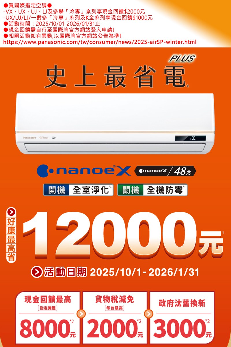 (含標準安裝)Panasonic國際牌變頻冷暖分離式冷氣8坪CS-UX50BA2-CU-UX50BHA2
