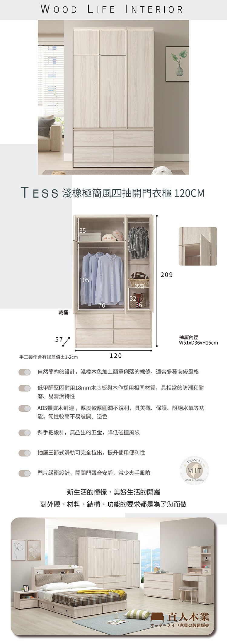 直人木業-TESS淺橡極簡風四抽滑門衣櫃120公分