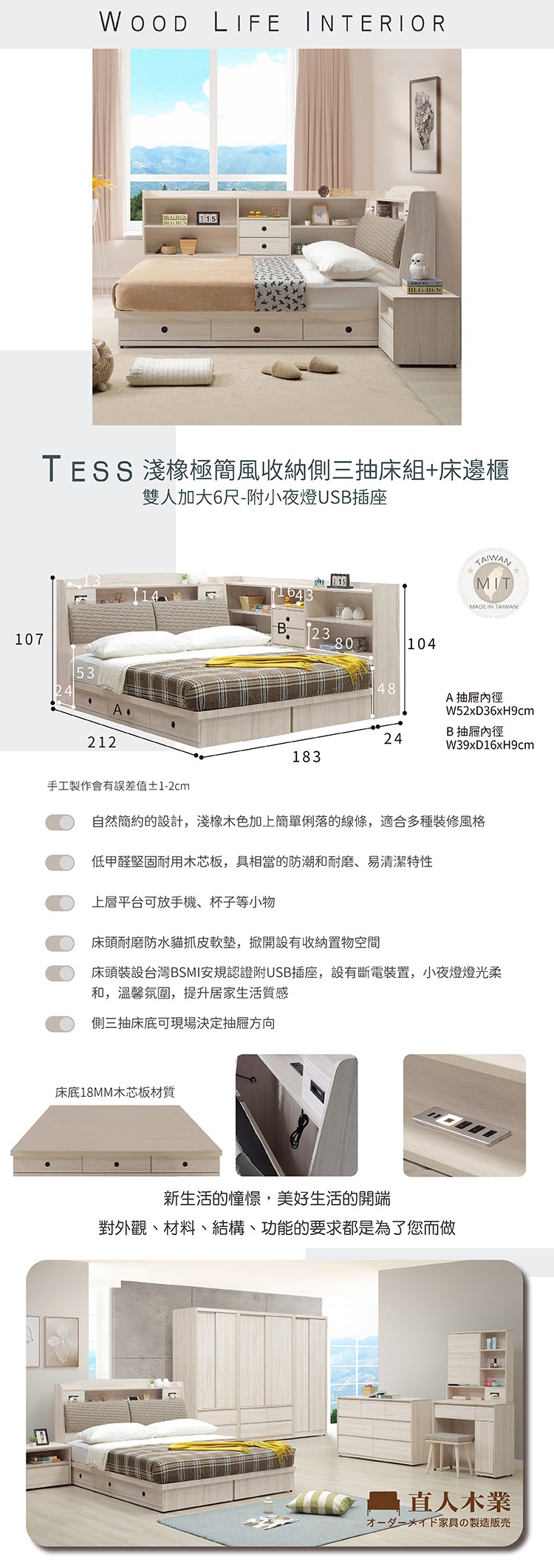 直人木業-DORIS現代風收納側兩抽床組搭配床邊櫃(附USB插座)-單人加大3.5尺