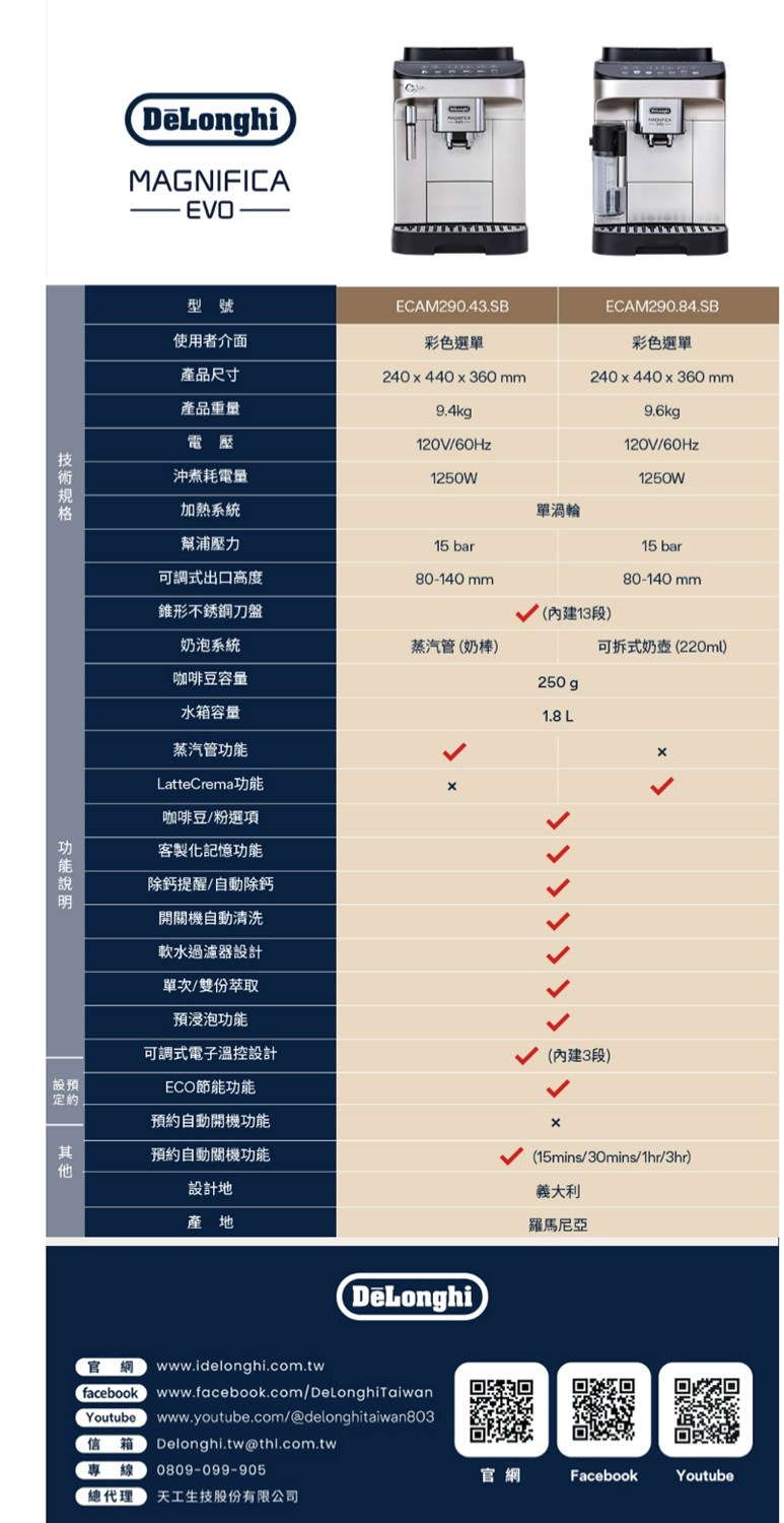 迪朗奇Delonghi ECAM290.84.SB 全自動義式咖啡機(EVO 系列)