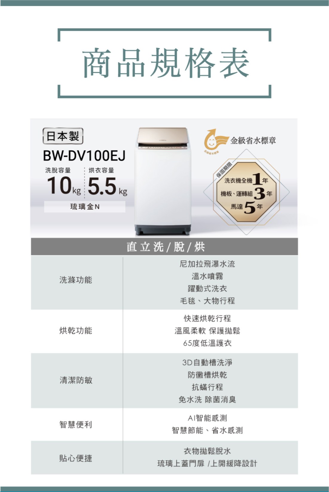 HITACHI 日立 10KG 日製變頻直立洗脫烘洗衣機 BWDV100EJ-N