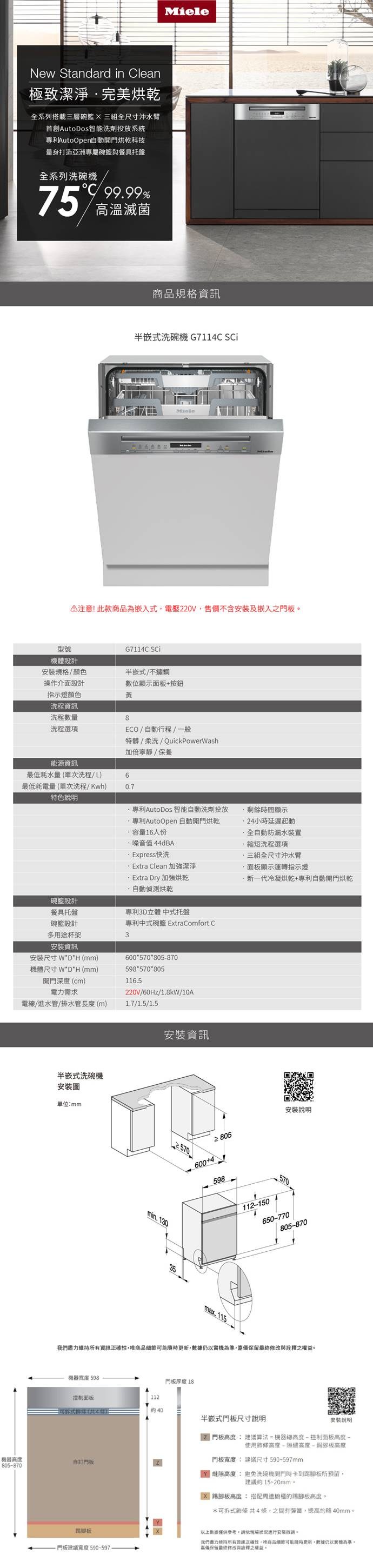 【德國 Miele】220V 自動開門烘乾 60公分半嵌式洗碗機 G7114C SCi/G7114CSCi 含基本安裝