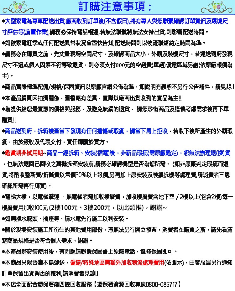 ◎大型家電為專車配送出貨,廠商收到訂單後(不含假日),將有專人與您聯繫確認訂單資訊及環境尺寸評估等(前置作業),請務必保持電話暢通,若無法聯繫將無法安排出貨,則影響配送時間
