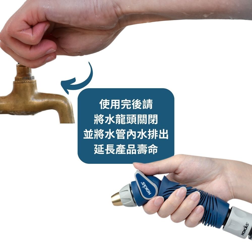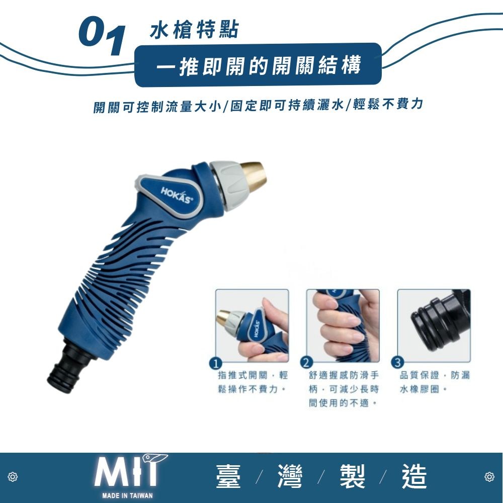 HOKAS最新型噴水槍搭配六段及無段式灑水噴頭。