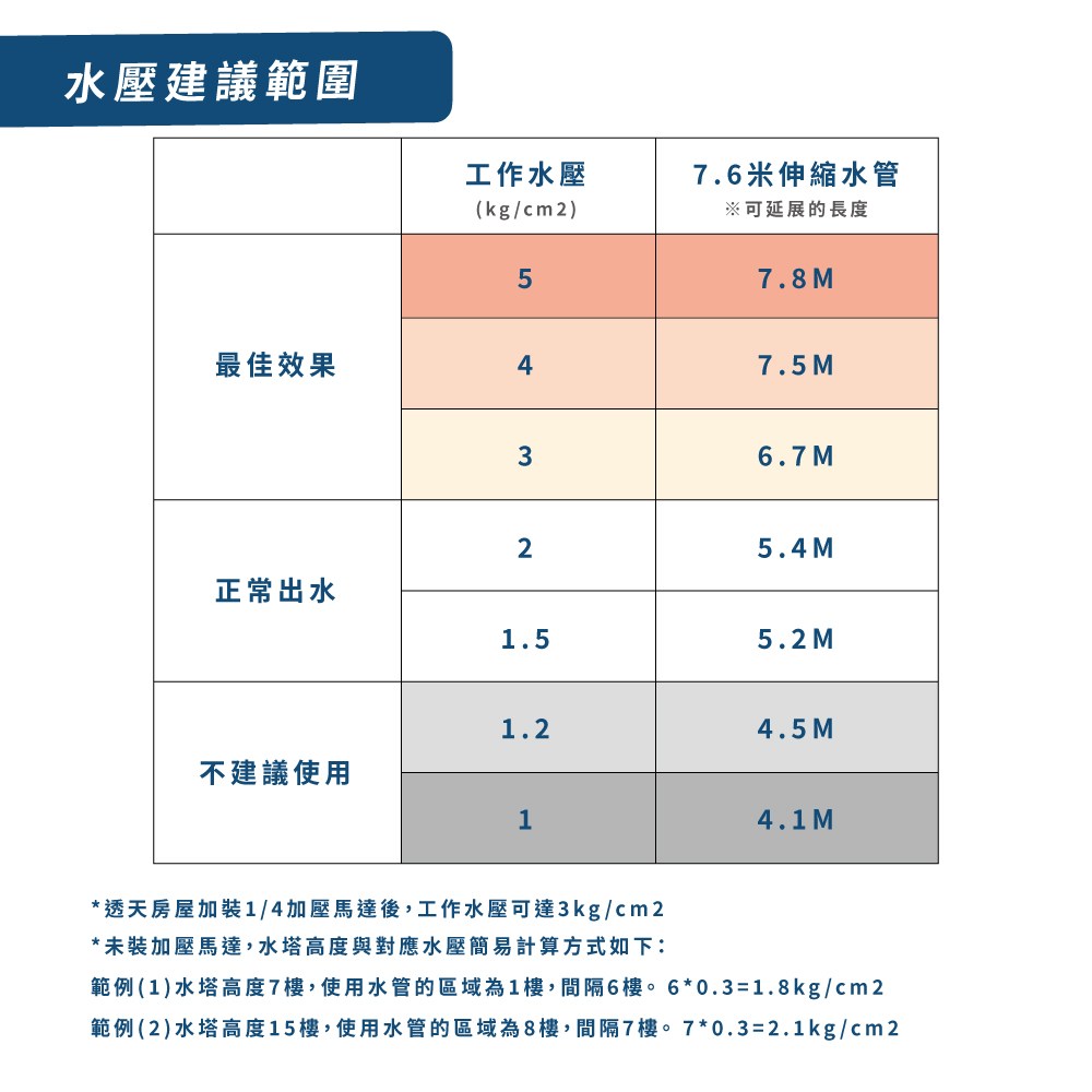 *工作水壓3~5kg/cm2 之間為最佳使用範圍。