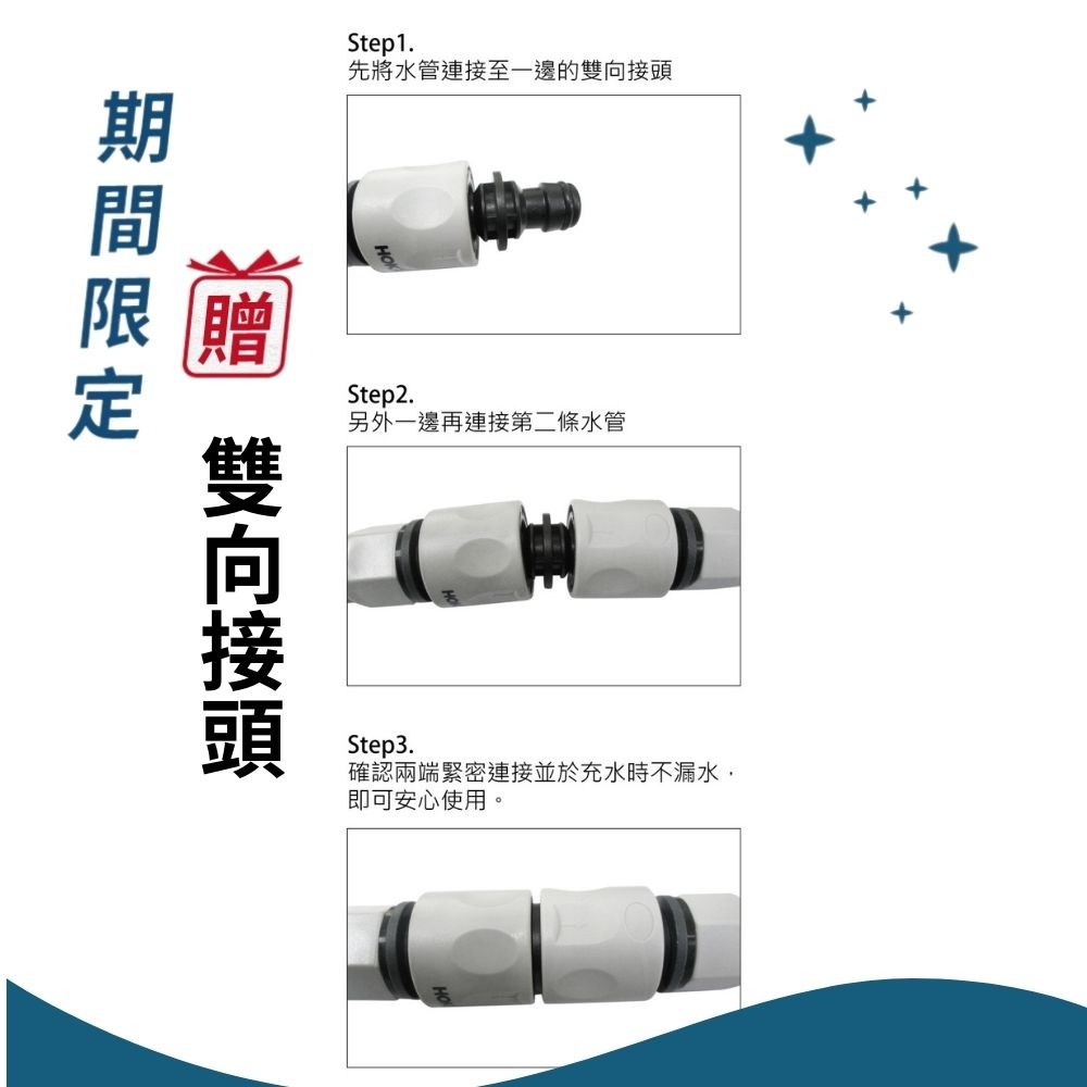 • 水管外層由強力特多龍特殊編織製成,內管採用強力 TPE 複合材料,具耐磨、防爆、防漏、可緩衝水柱壓力等特點,並且不易扭曲、打結。
