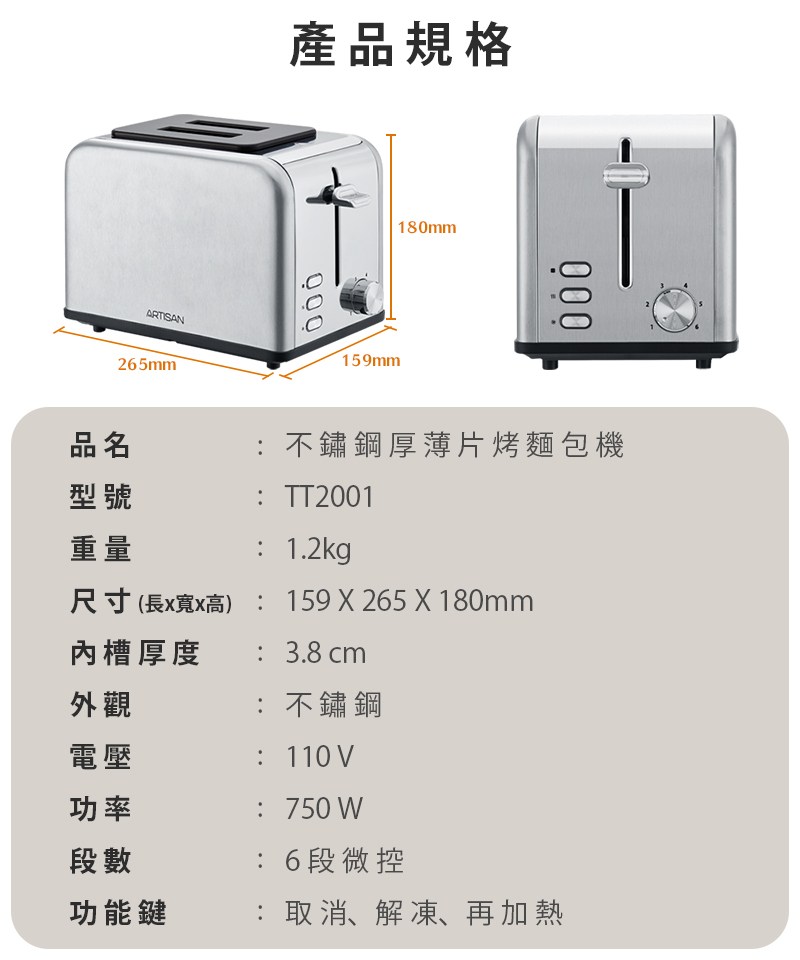 【ARTISAN】不鏽鋼厚薄片烤麵包機 TT2001