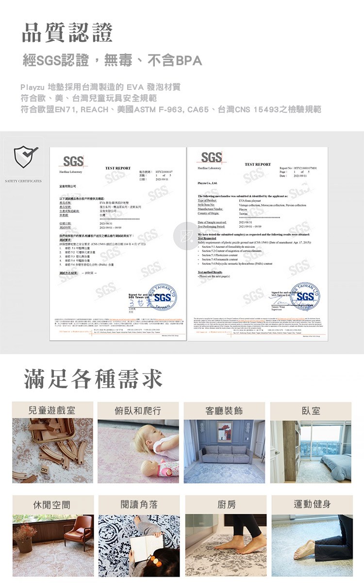所有產品均經過認證不含BPA且無毒。 為了達到最高的生產標準,我們的地墊經過SGS認證。