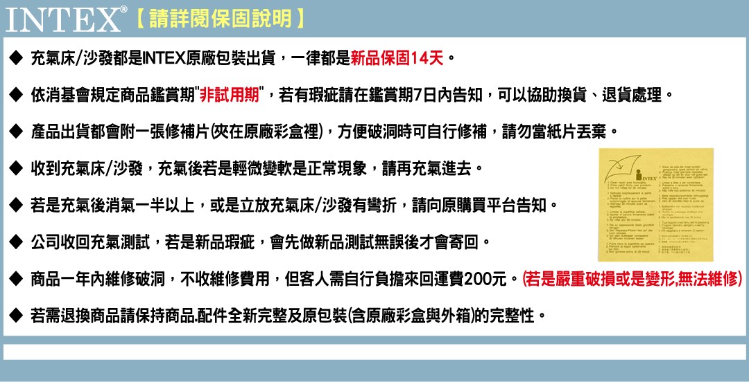 ◆ 原廠公司貨,INTEX美國首選充氣床品牌,購買最安心,唯一附保固卡。