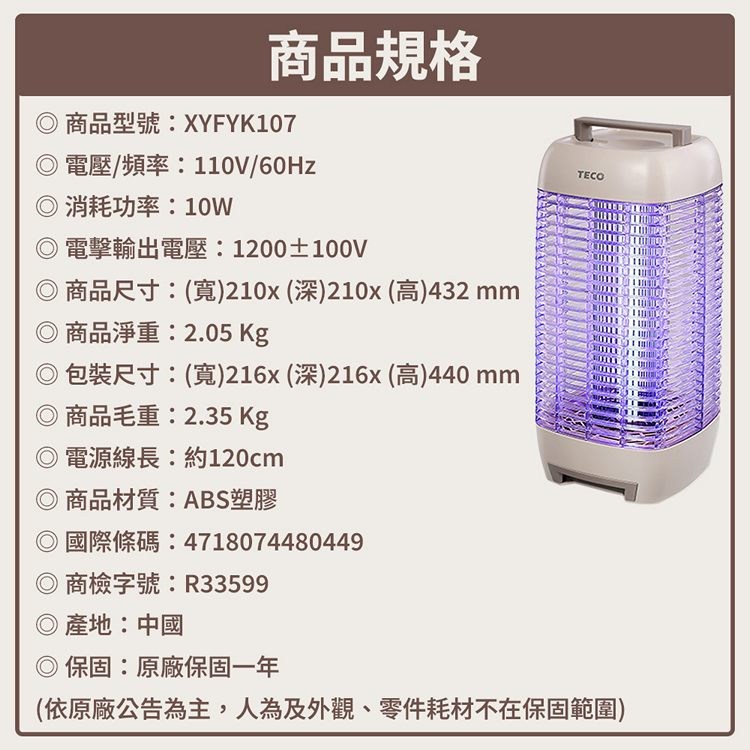 TECO東元 10W電擊式捕蚊燈 XYFYK107