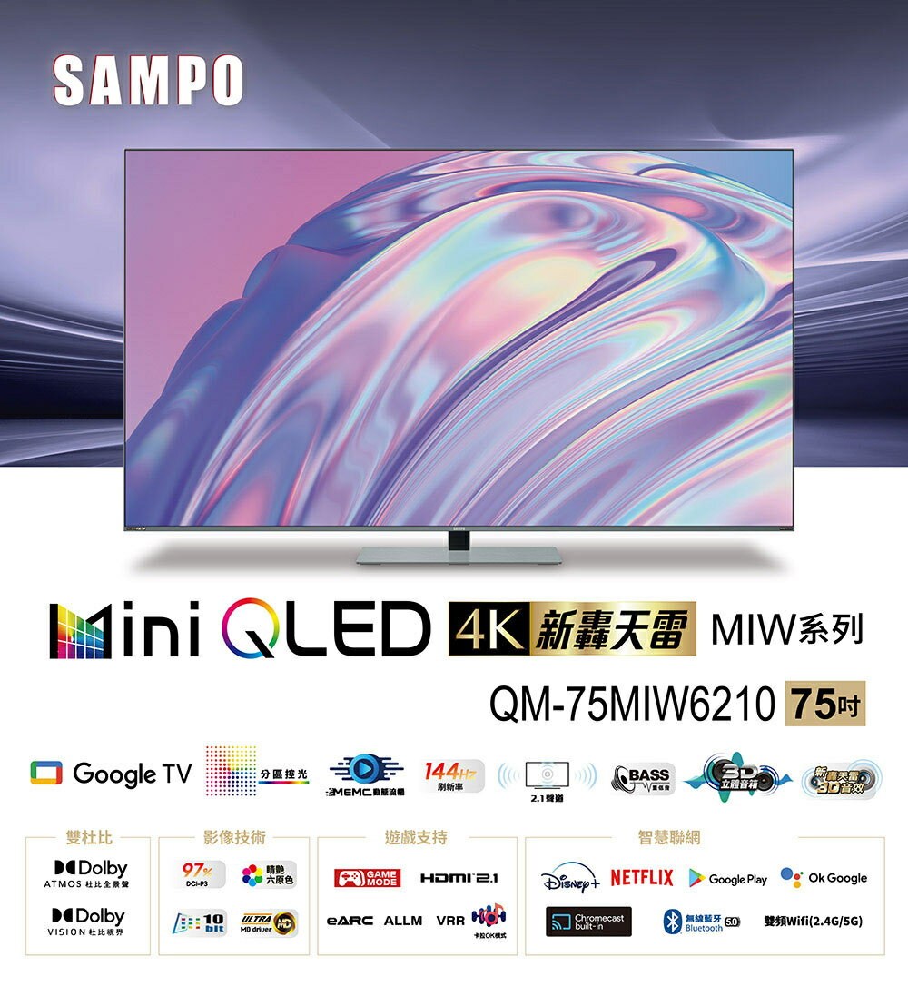 SAMPO聲寶 75吋 MINI QLED 聯網新轟天雷3D立體音箱液晶顯示器 QM-75MIW6210含基本安裝+舊機回收