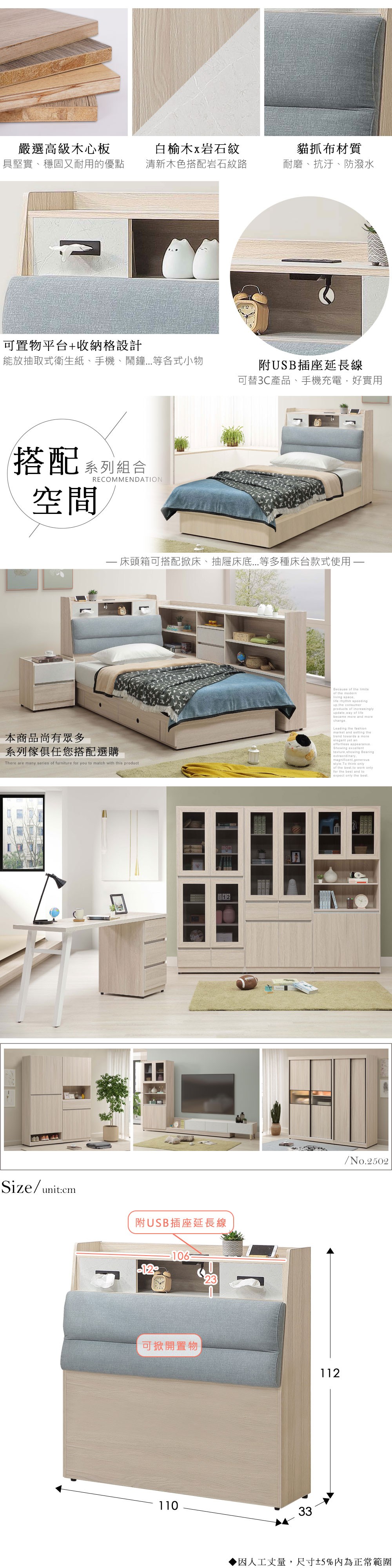 【顛覆設計】露納插座收納靠枕床頭箱(單大3.5尺)雪松色