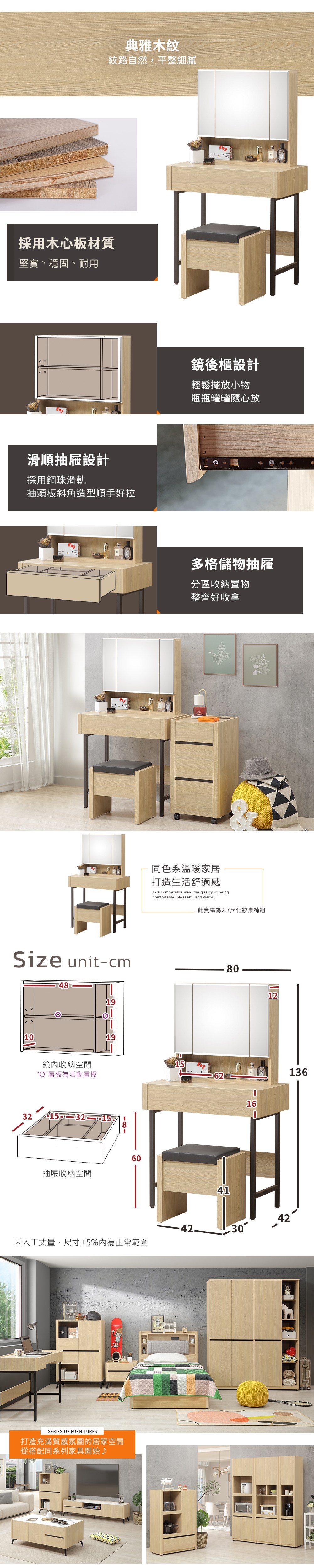 【IDEA】MIT凡賽60CM收納梳妝桌椅/化妝桌椅組 化妝台(3色任選)北歐橡木
