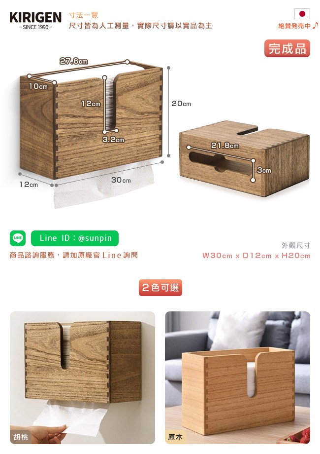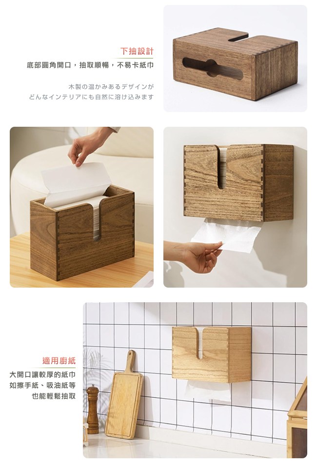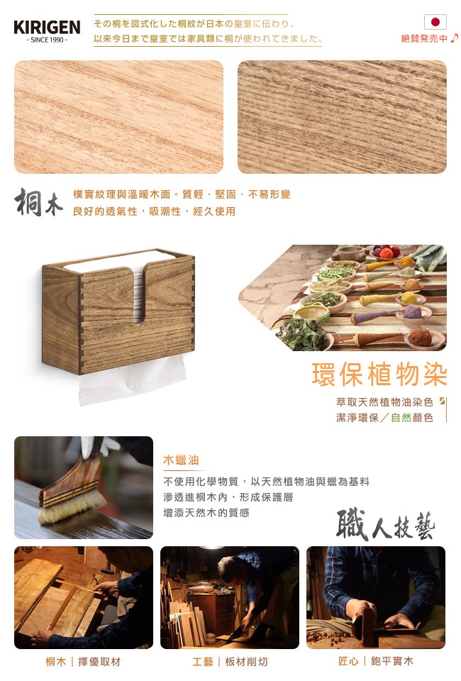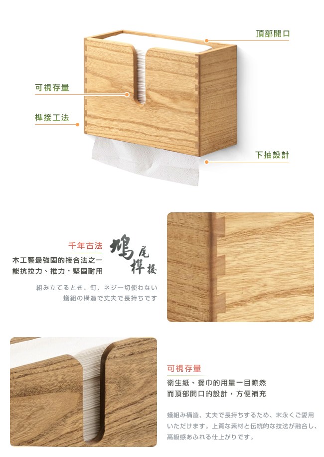 為生活的幸福感而設計,愛上收納就從現在開始。環保植物染不用化學物質,以天然植物油與蠟為基料,滲透進桐木內形成保護層,增添天然木的質感。傳統榫接工法,堅固耐用。下抽設計,底部圓角開口,抽取順暢,不易卡紙巾。而大開口讓較厚的紙巾,如擦手紙、吸油紙等也能輕鬆抽取。可視存量,衛生紙、餐巾紙的用量一目瞭然,而頂部開口的設計,方便補充。