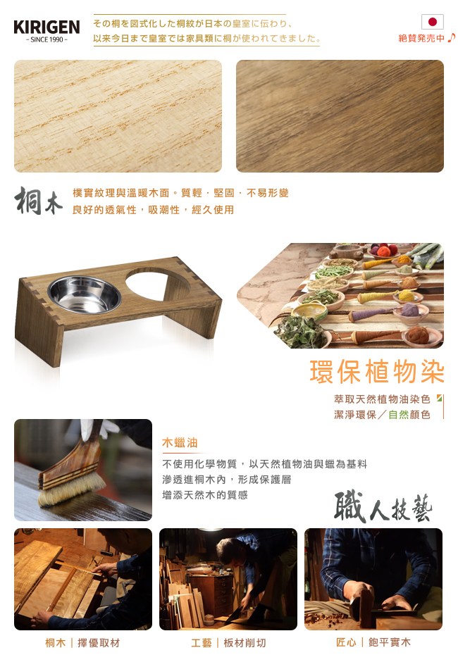 環保植物染不用化學物質,以天然植物油與蠟為基料,滲透進桐木內形成保護層,增添天然木的質感。碗架分離設計,鋼碗方便拿取,輕鬆省力倒入飼料與清洗。斜口 15 度角,讓貓狗在進食時,不用一直低著頭,更容易吞嚥食物,並減緩頸椎與胃部壓力。三碗組分別盛入乾糧、濕糧、飲水,不同飼料的口感,豐富的營養,讓寵物的健康一次到位。可自行黏貼防刮絨墊,避免刮花地板。