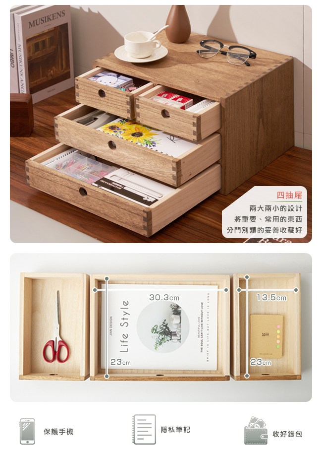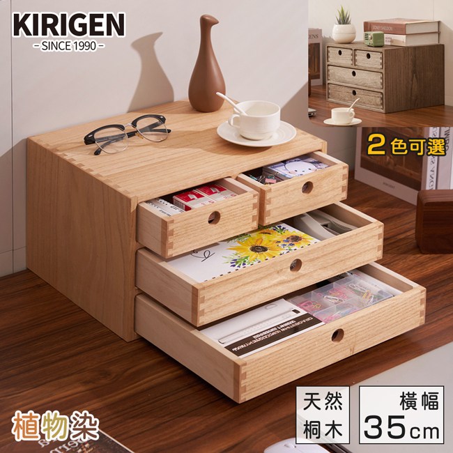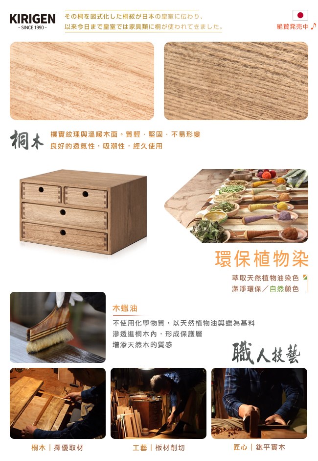 為生活的幸福感而設計,愛上收納就從現在開始。環保植物染不用化學物質,以天然植物油與蠟為基料,滲透進桐木內形成保護層,增添天然木的質感。傳統榫接工法,堅固耐用。圓孔把手,手指方便勾取,讓抽屜好開關。實木背板,不易受潮與發霉。