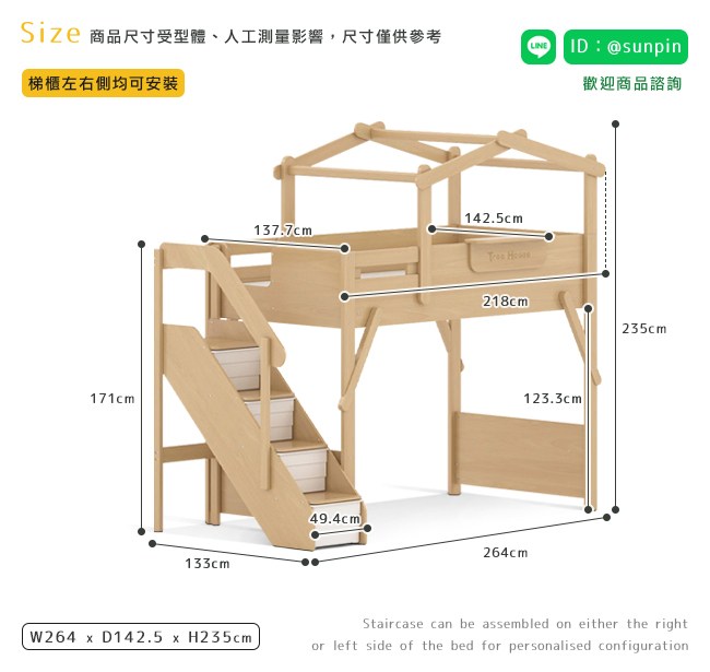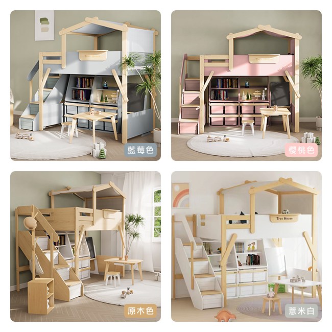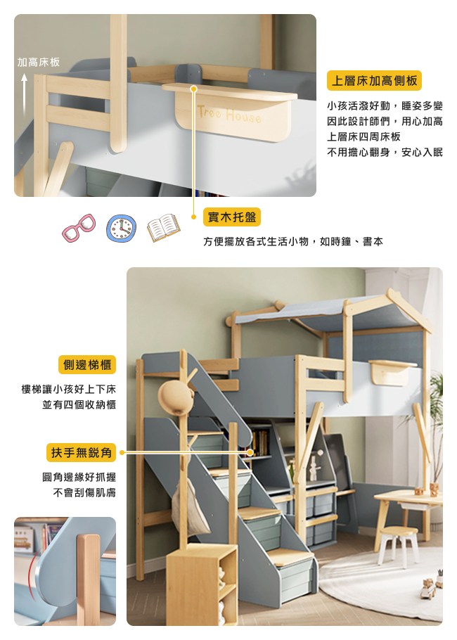 彷彿林中的小樹屋,滿足探索的好奇心,讓孩子從小發揮想像力、創造力,建造自己的小天地。主材是山毛櫸,外觀平滑少木節,結構堅硬沈重,承重好,經久耐用。孩子睡姿多變、活潑好動,因此設計師加高上層床四周床板,讓小孩不用擔心翻身,安心入眠。實木側向支撐加固,樹屋四平八穩,不易搖晃。無銳角床架,圓角邊緣不刮手,避免刮傷。側邊梯櫃讓小孩好上下床,並有四個收納櫃,可放繪本、玩具、布偶,讓房間井然有序。