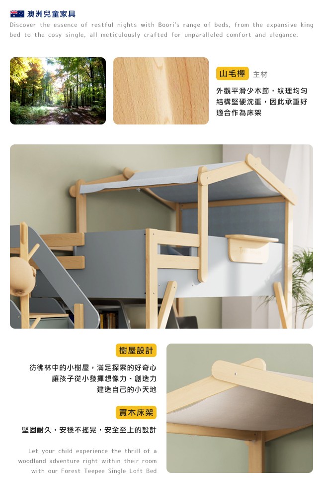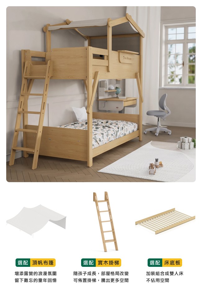 賣場不包含床墊,推薦選配 Boori 專屬獨立筒床墊、頂帆布篷、實木掛梯、床底板。