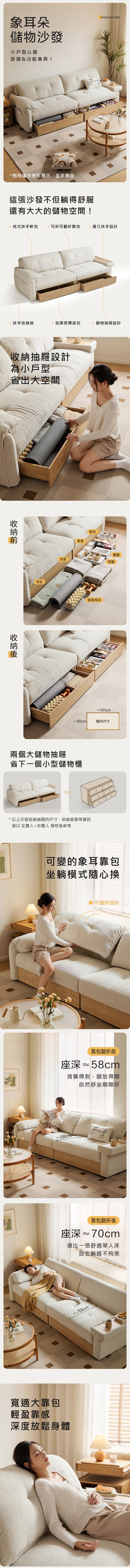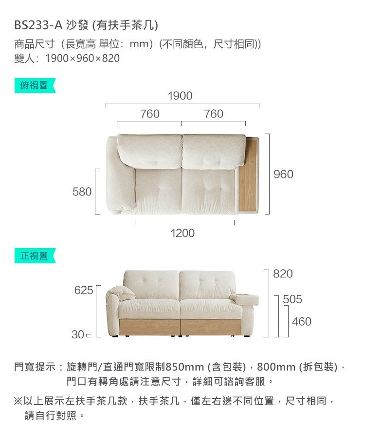 hoi!林氏木業大象耳朵儲物左扶手茶几1.9M雙人沙發 BS233-米白色