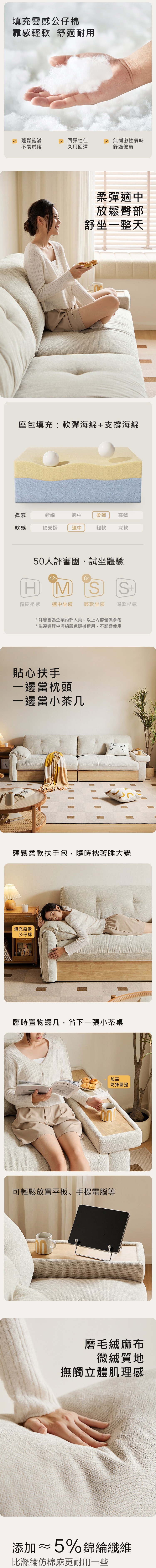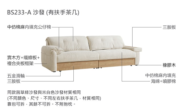 hoi!林氏木業翻轉扶手貓抓布三人布沙發1.8M BS171 流花白