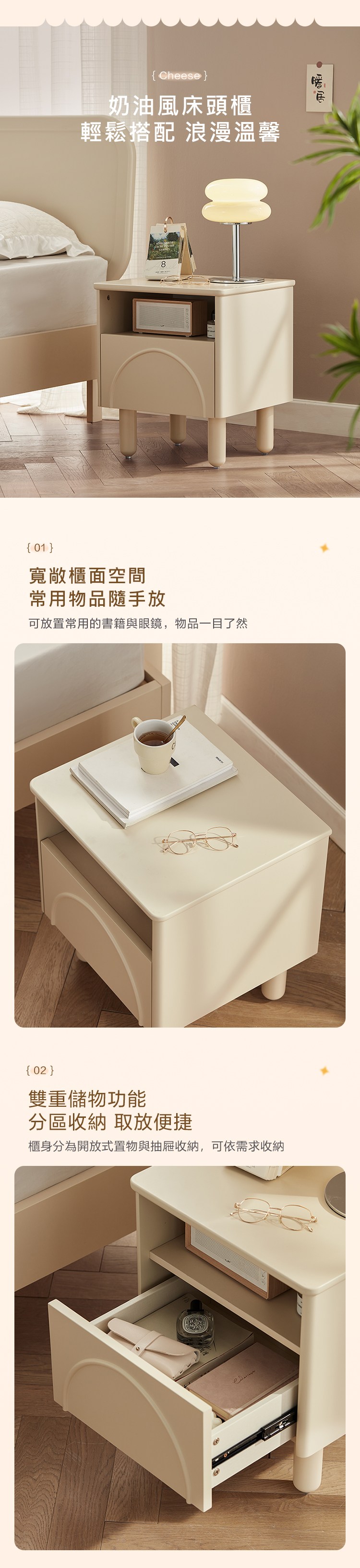 *注意:以下為情境示意圖,實際商品款式為奶油侘寂風單抽床頭櫃 NU1B