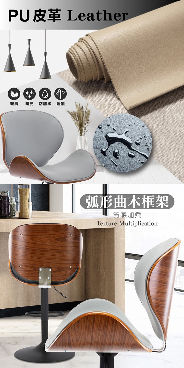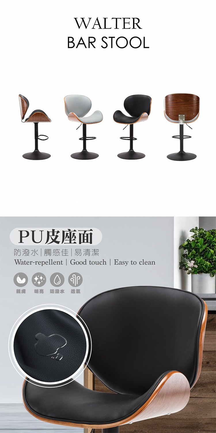 台灣與歐美同步販售、美規設計,防潑水PU皮座面,觸感佳易清潔,搭配獨特弧形曲木框架質感加乘,