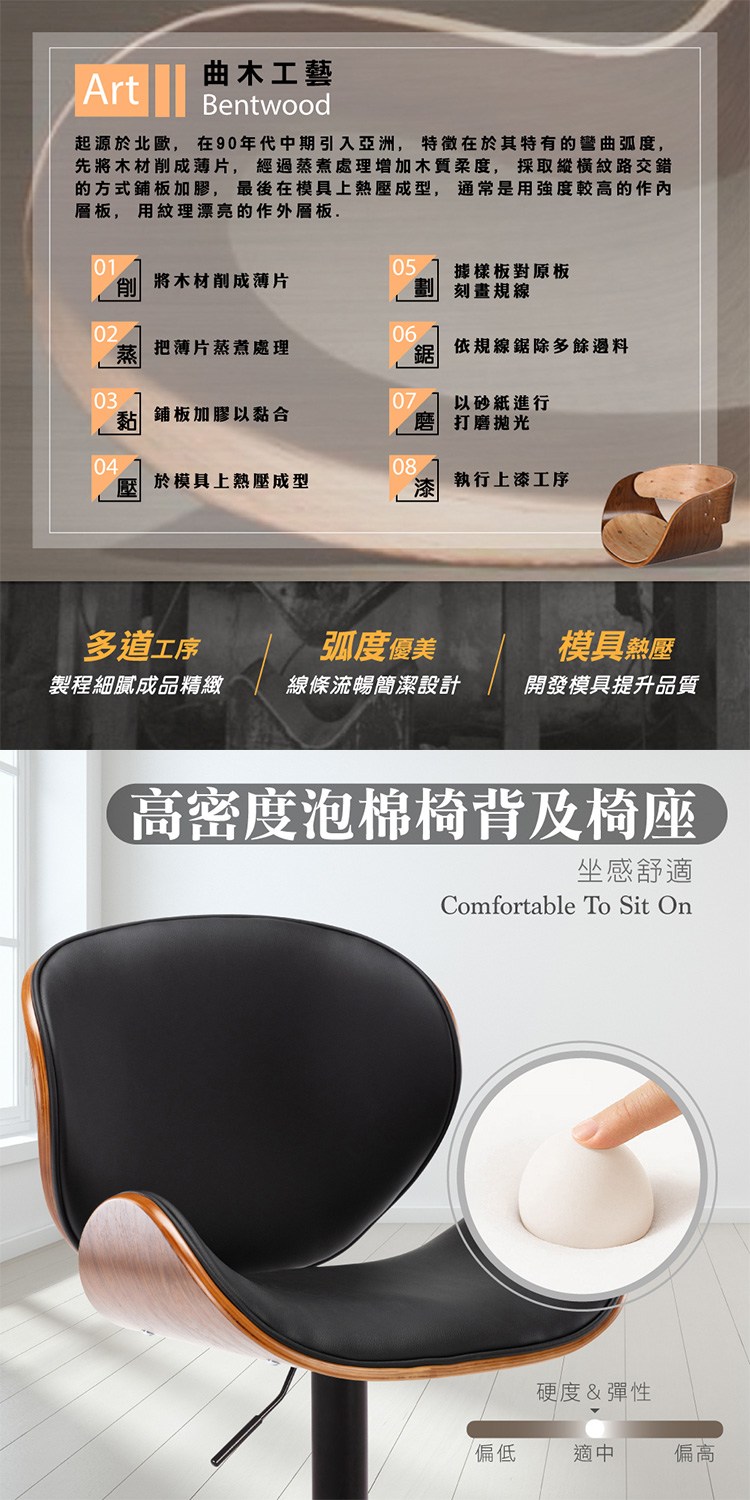 材質:PU+曲木+泡棉+黑漆金屬圓盤腳