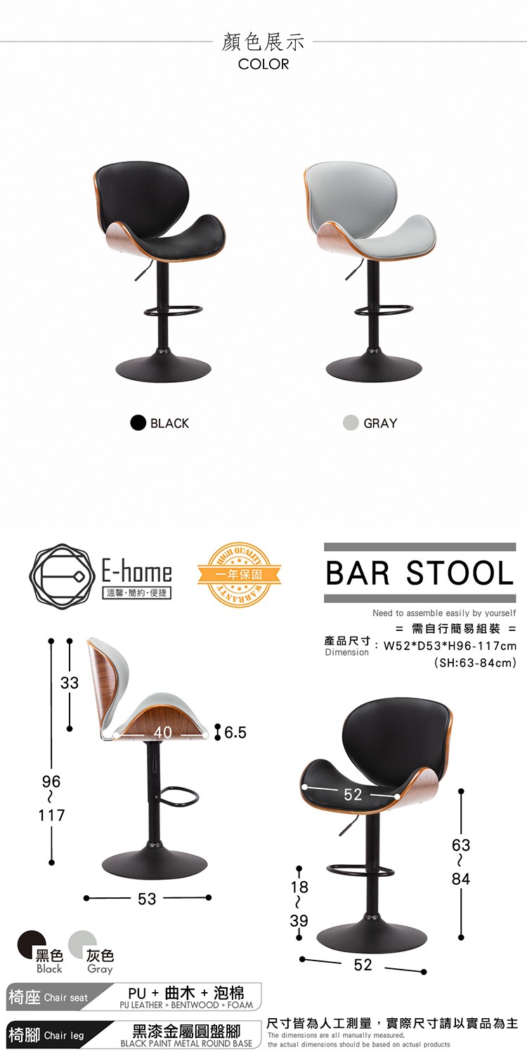 [E-home]Walter沃特PU曲木升降黑腳吧檯椅,時尚與古典的結合滿足生活品味,讓您居家空間瞬間耀眼起來。