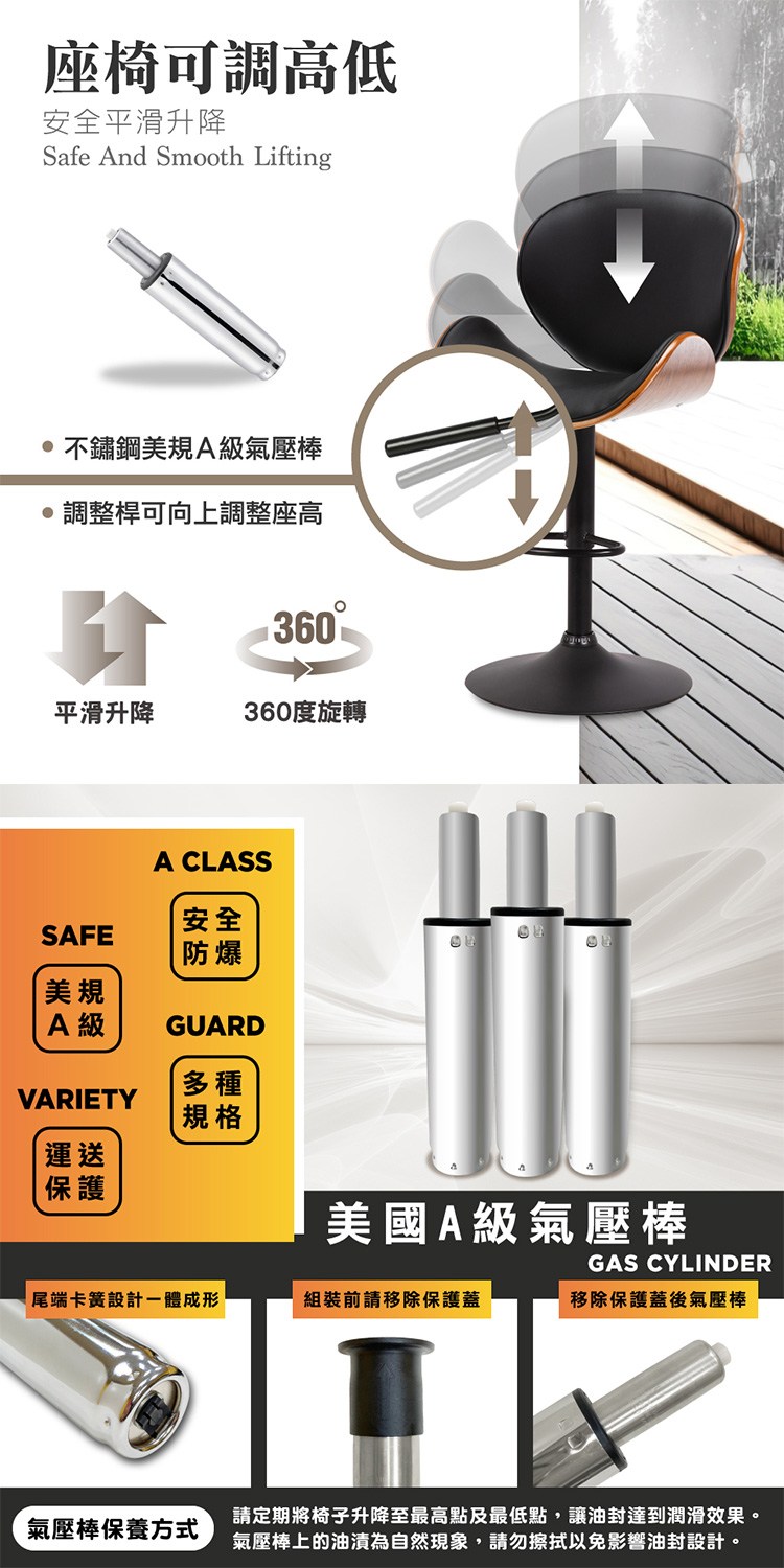高密度泡棉椅背及椅座坐感舒適,配備美規A級氣壓棒、安全升降,360°旋轉含有腳踏提供舒適倚靠,