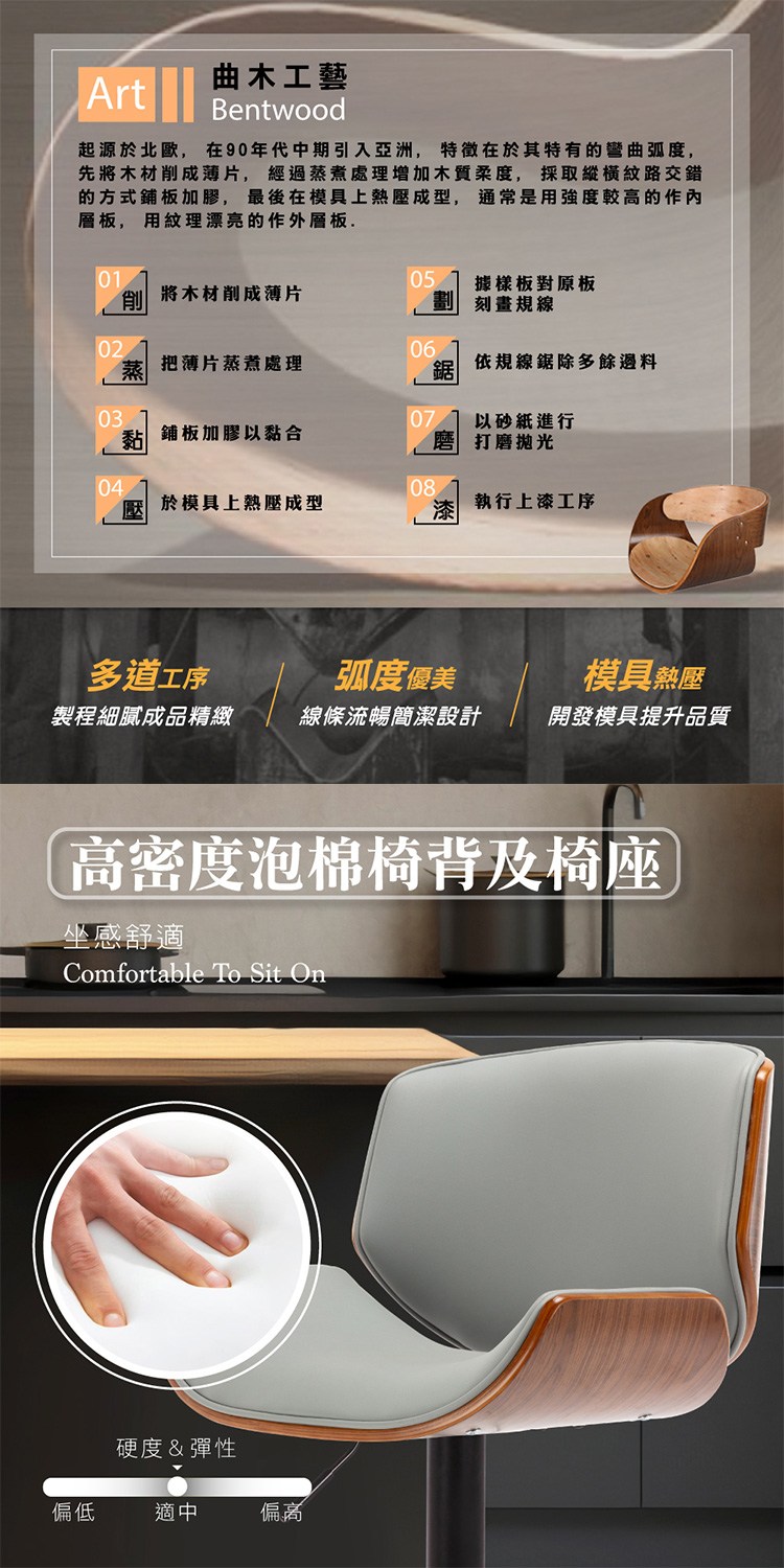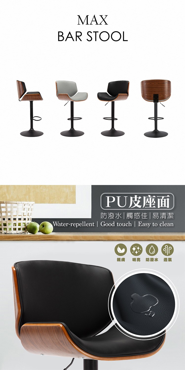 台灣與歐美同步販售、美規設計,防潑水PU皮座面,觸感佳易清潔,搭配獨特弧形曲木框架質感加乘,