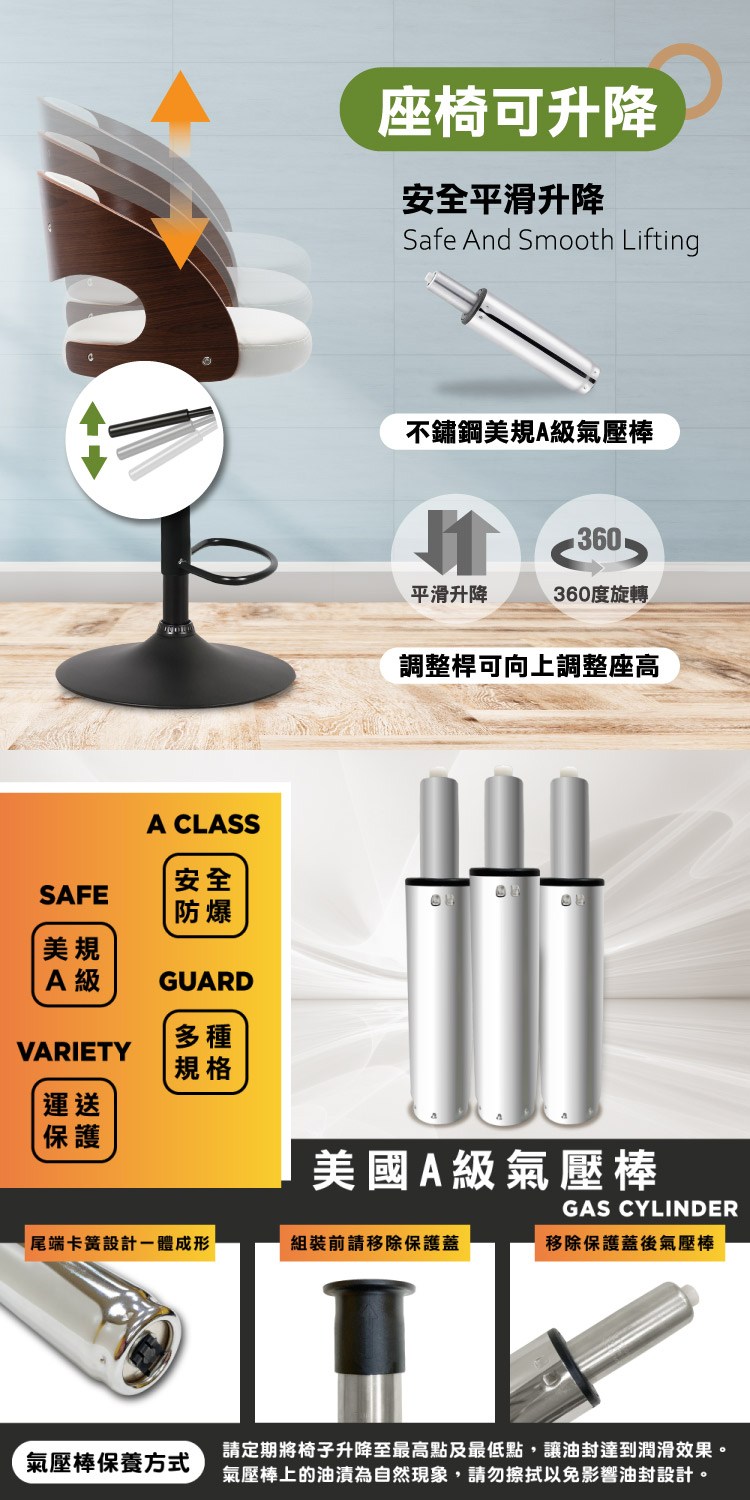 厚實泡棉坐墊,增加舒適之坐感,配備美規A級氣壓棒、安全升降,360°旋轉含有腳踏提供舒適倚靠,