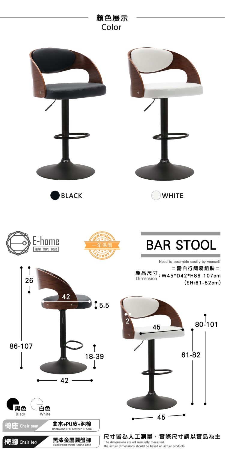 E-home Finn芬恩曲木PU升降黑腳吧檯椅-兩色可選