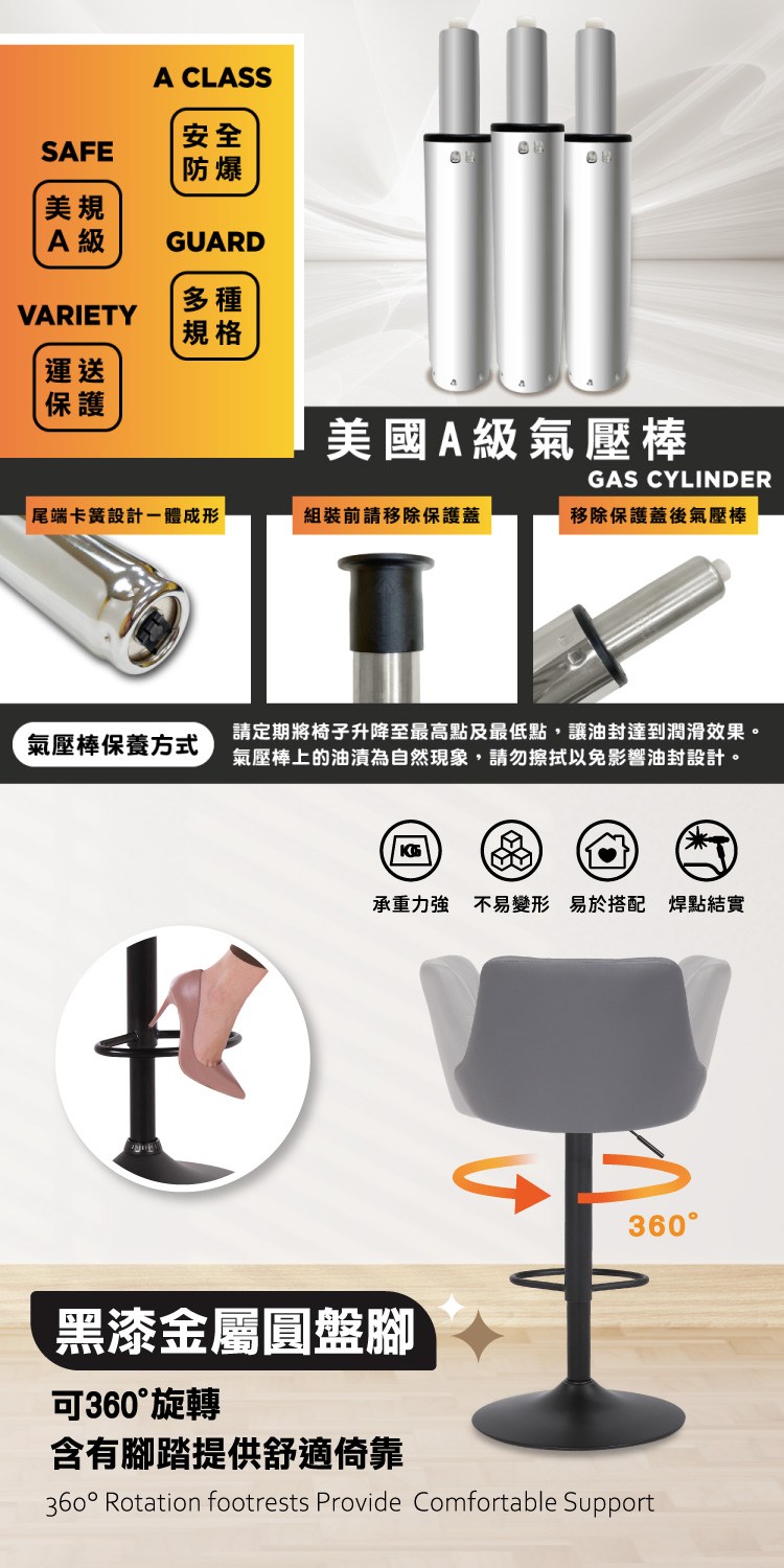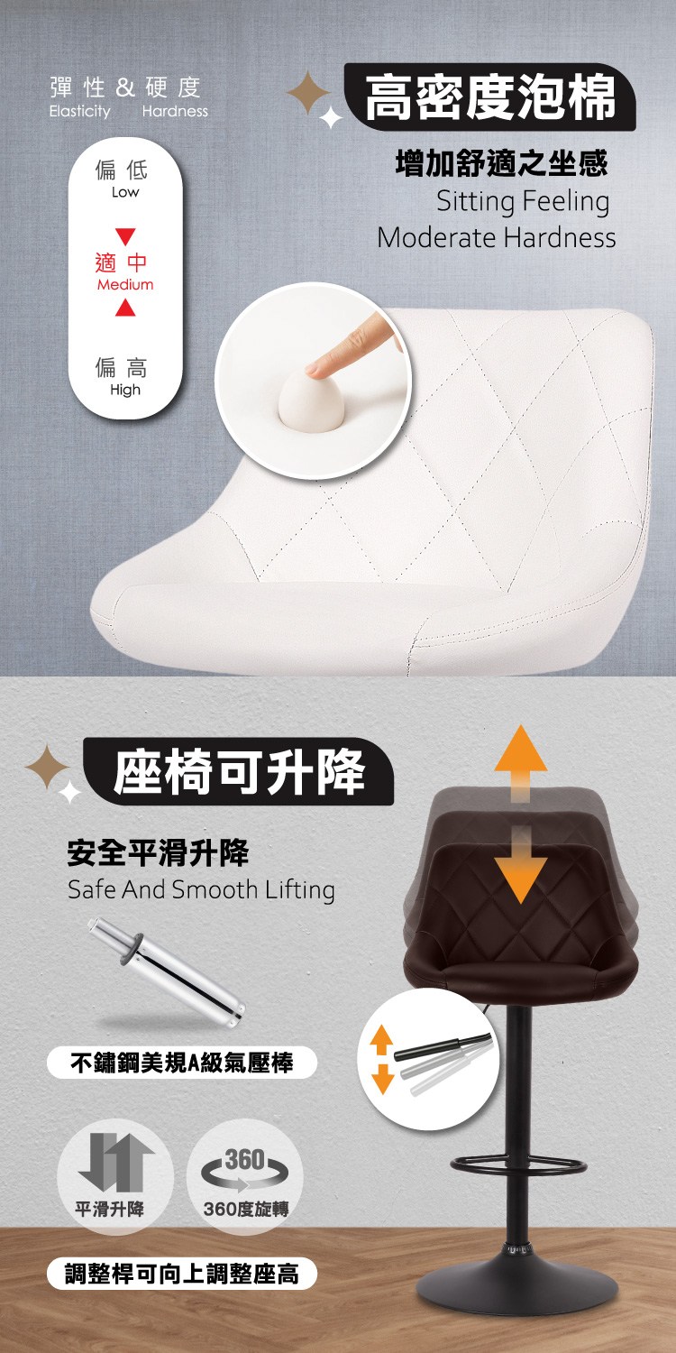 高密度泡棉椅背及椅座坐感舒適,配備美規A級氣壓棒、安全升降,360°旋轉含有腳踏提供舒適倚靠,
