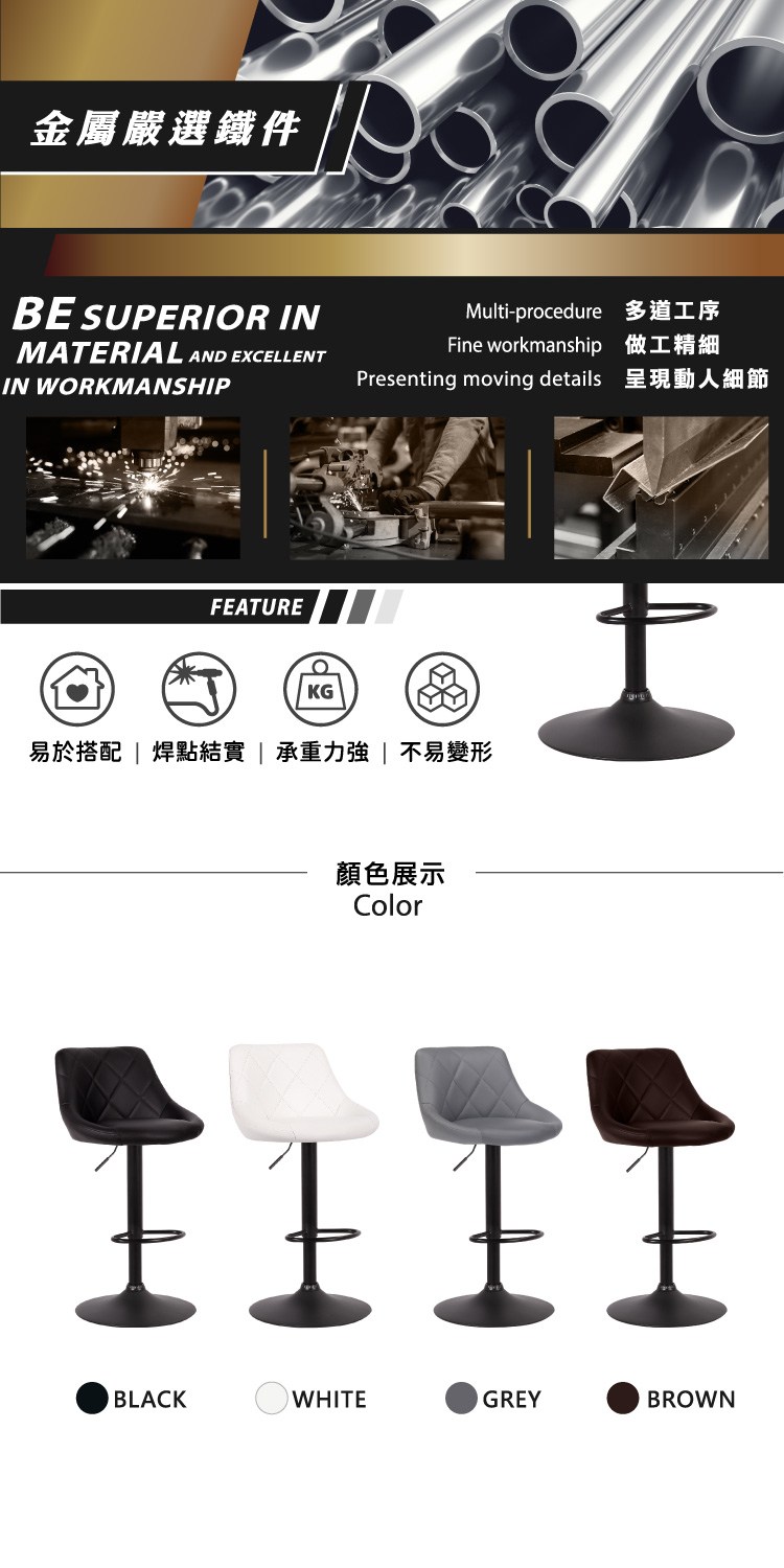 黑漆金屬圓盤腳、穩定且承重強,易於搭配的顏色為空間注入創意,可配合吧檯或中島,享受完全的機動性。