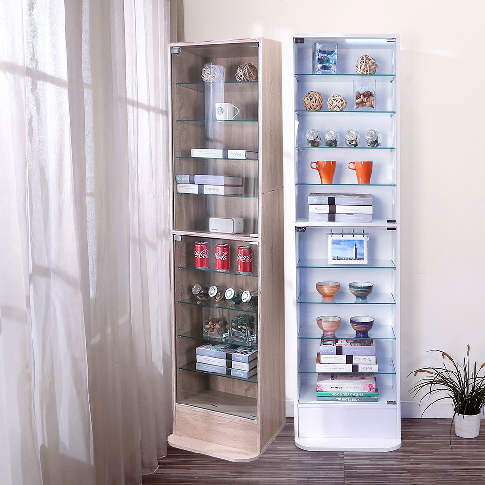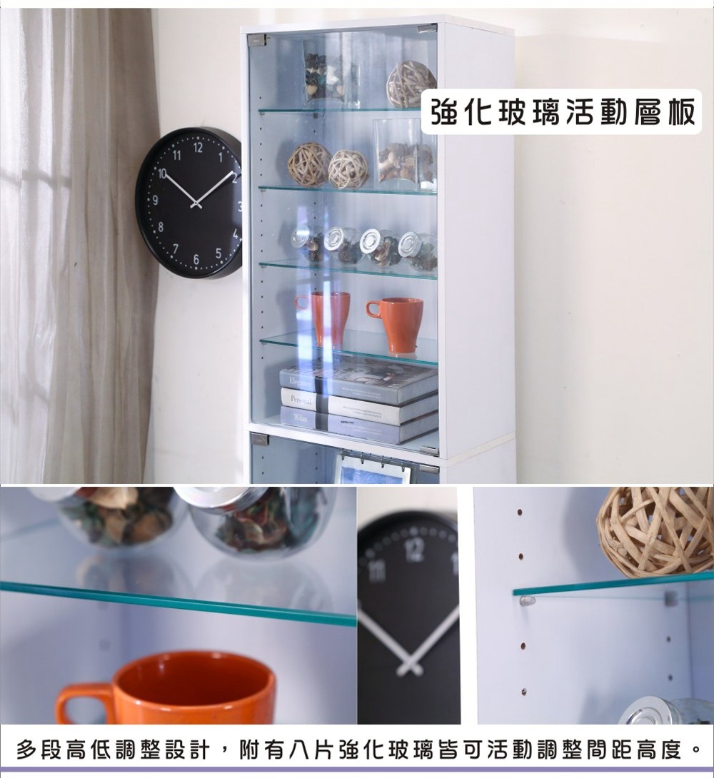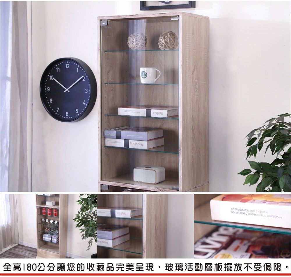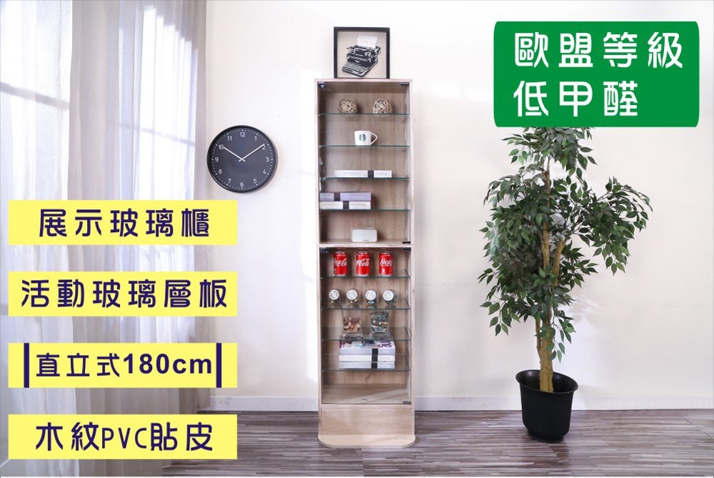 讓公仔們有個家吧,放到展示櫃裡擺放觀賞,朋友來時可以一同分享收藏,同時也可以裝飾家中的角落,全高180cm讓您完美呈現收藏品,8片玻璃活動層版可自由調整讓擺放不受限,按壓式玻璃門採用5mm強化玻璃,既安全又美觀,還不用擔心灰塵髒汙附著。底部10.5cm防傾倒底板延伸可使整體更加穩固,此外整體板材使用低甲醛E1健康板材,讓您用的安心。不只可以放玩具公仔模型也可以當書櫃用或放小朋友的娃娃,如此多功能的櫃子,是家中不可或缺的好物。