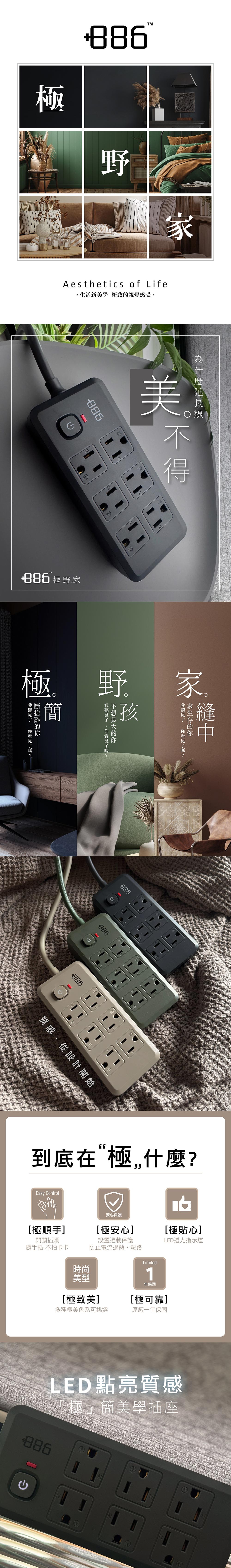 +886 極野家 1開6插過載保護延長線1.8米 V2 軍綠