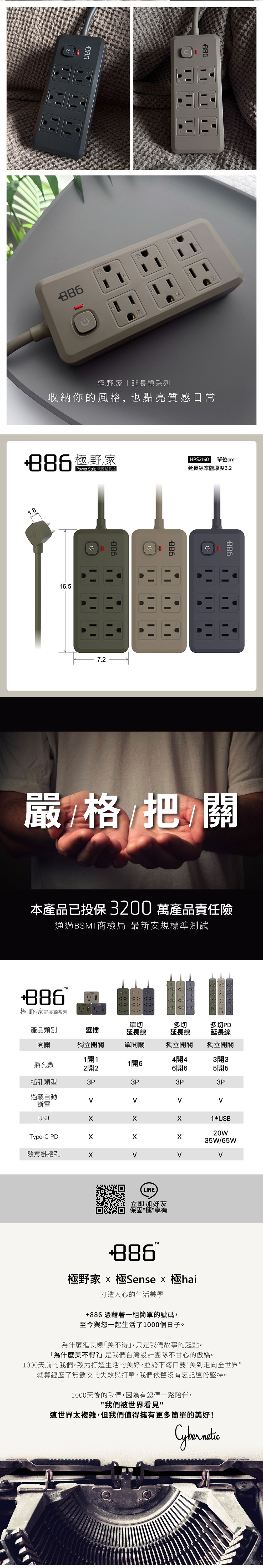 +886 |極野家 4開3插 USB+Type C PD快充延長線 1.8m 三色 - 軍綠