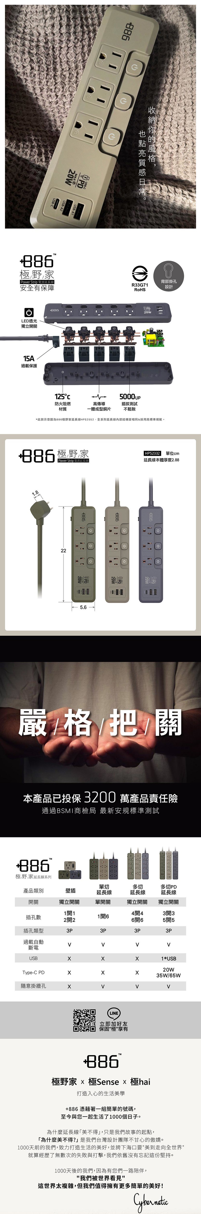+886 極野家 3開3插 PD 20W 快充延長線1.8米 V2 迷霧灰
