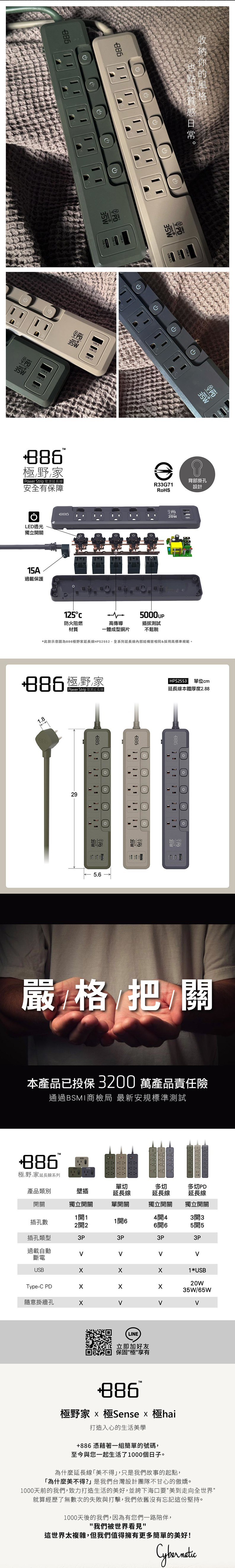 +886 極野家 6開6插過載保護延長線1.8米 V2 迷霧灰