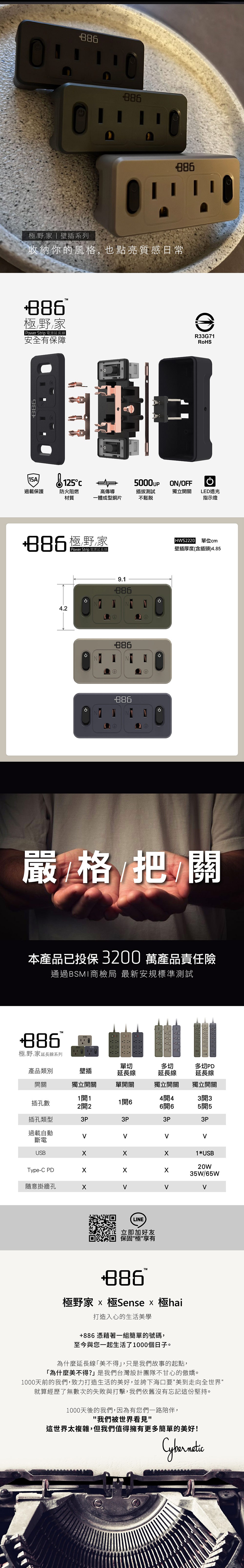 +886 |極野家 4開3插 USB+Type C PD快充延長線 1.8m 三色 - 軍綠